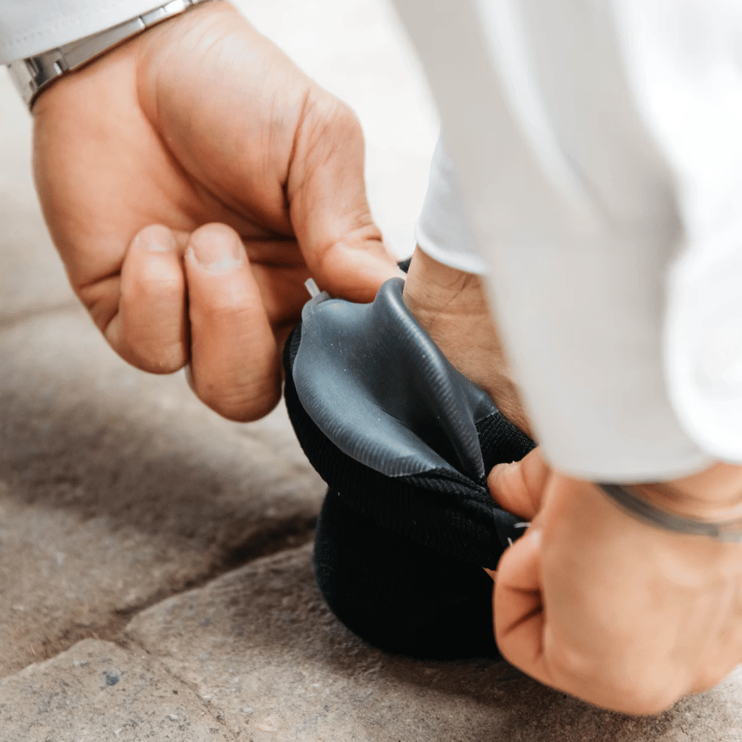 The Achilles Gel Socks are lightweight and comfortable riding socks, designed to meet the demands from skin-sensitive riders. Besides the soft foot sole, there is an additional comfort and protection to the Achilles area with a strong shock absorbing gel. The socks reduce pain caused by pressure of the spurs onto the zipper. They provide relief from pump bumps or sore, fatigued or injured Achilles tendon. The gel slowly releases medical grade mineral oil which softens and moisturizes the skin. The socks fit both feet. They are machine washable at 30°, no dryer. Sprinkle the gel with Talcum powder if it becomes tacky.