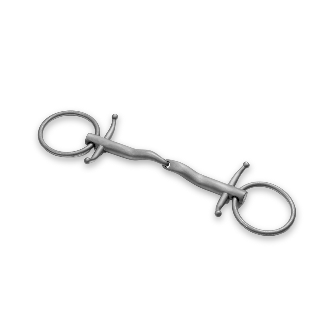 The small cheek pieces prevents the corners of the horse's mouth from being pinched by the rings, while also stabilizing the bit and preventing it from slipping. It also makes it easier to turn and keep the horse framed. Bhoof’s lightweight Baby Fulmer bit is crafted from 100% titanium.