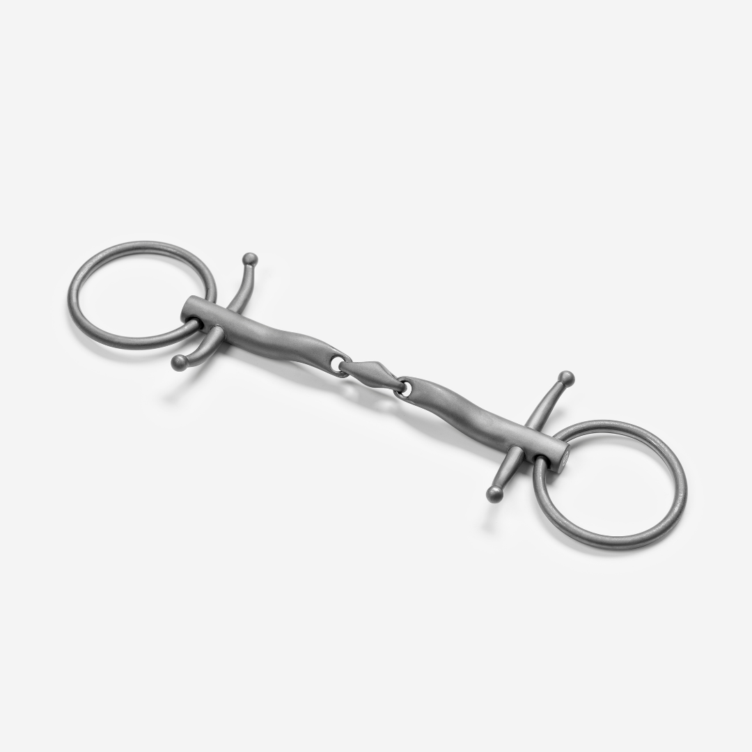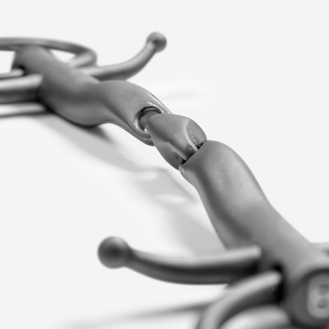 The small cheek pieces prevents the corners of the horse's mouth from being pinched by the rings, while also stabilizing the bit and preventing it from slipping. It also makes it easier to turn and keep the horse framed. Bhoof’s lightweight Baby Fulmer bit is crafted from 100% titanium.