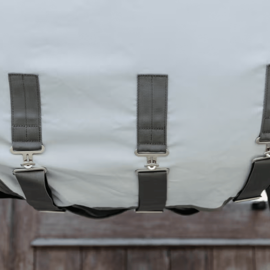 To protect the belly area the rug features a belly flap. This flap is closed by 3 straight surcingles. The tail flap is a little bit longer than usual and features an elastic for the tail.