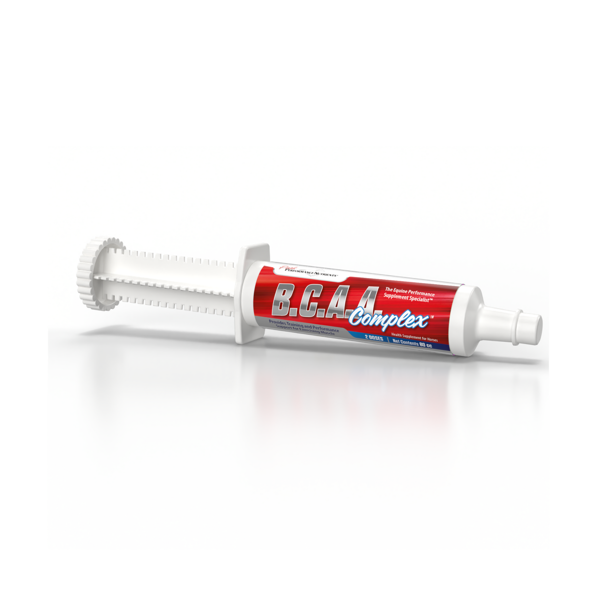 B.C.A.A. Complex is a unique combination of the muscle supporting amino acids L-Valine, L-Leucine and L-Isoleucine, collectively called Branched Chain Amino Acids. B.C.A.A. Complex can be administered daily for attitude, muscularity and recovery. Additionally, B.C.A.A. Complex can be administered as a three day pre-event without the need for event day administration. B.C.A.A. Complex supports a more alert and energetic horse with the ability to maintain his top speed longer. Supplemented Branched Chains work by feeding exercising muscles into growth and repair instead of tired muscles feeding off of existing protein producing a catabolic (muscle wasting) state.