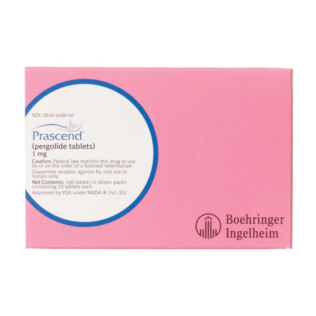 Side Effects: Prascend® side effects in horses are rare. Prascend®: appears to be well tolerated in horses. Rare side effects may include lethargy, colic, diarrhea and weight loss. Decreased appetite may be seen during the first week of therapy.Warnings: Do not use in horses that are allergic to Prascend® or other ergot-derivatives.Do not use in horses that are to be used for human consumption.Use with caution in horses that are pregnant, lactating or used for breeding. Safe use in these animals has not yet been evaluated. Prascend® is approximately 90% associated with plasma proteins. Use caution if administering Prascend® with other drugs that affect protein binding. Dopamine antagonists, such as neuroleptics (phenothiazines, domperidone) or metoclopramide, ordinarily should not be administered concurrently with Prascend® (a dopamine agonist) since these agents may diminish the effectiveness of Prascend®.Not for use in humans. Prascend® should not be administered by persons who have had adverse reactions to ergotamine or other ergot derivatives. Pregnant or lactating women should wear gloves when administering this product. It has been reported that pergolide tablets may cause eye irritation, an irritating smell, or headache when Prascend® tablets are split or crushed. Prascend® tablets should not be crushed due to the potential for increased human exposure and care should be taken to minimize exposure when splitting tablets. Consult a physician in case of accidental ingestion by humans.Keep Prascend® in a secure location out of reach of dogs, cats, and other animals to prevent accidental ingestion or overdose. Dogs have eaten Prascend® tablets that were placed in food intended for horses or dropped during administration of the tablets to the horses. Adverse reactions may occur if animals other than horses ingest Prascend® tablets.Overdoses can be very dangerous. Keep out of reach of children and animals.Always follow the dosage instructions provided by your veterinarian. If you have difficulty giving the medication, contact your veterinarian.If you miss a dose, give it as soon as you remember. If it is almost time for the next dose, skip the one you missed and go back to the regular schedule. Do not give two doses at once.This medication should only be given to the horse for whom it was prescribed.