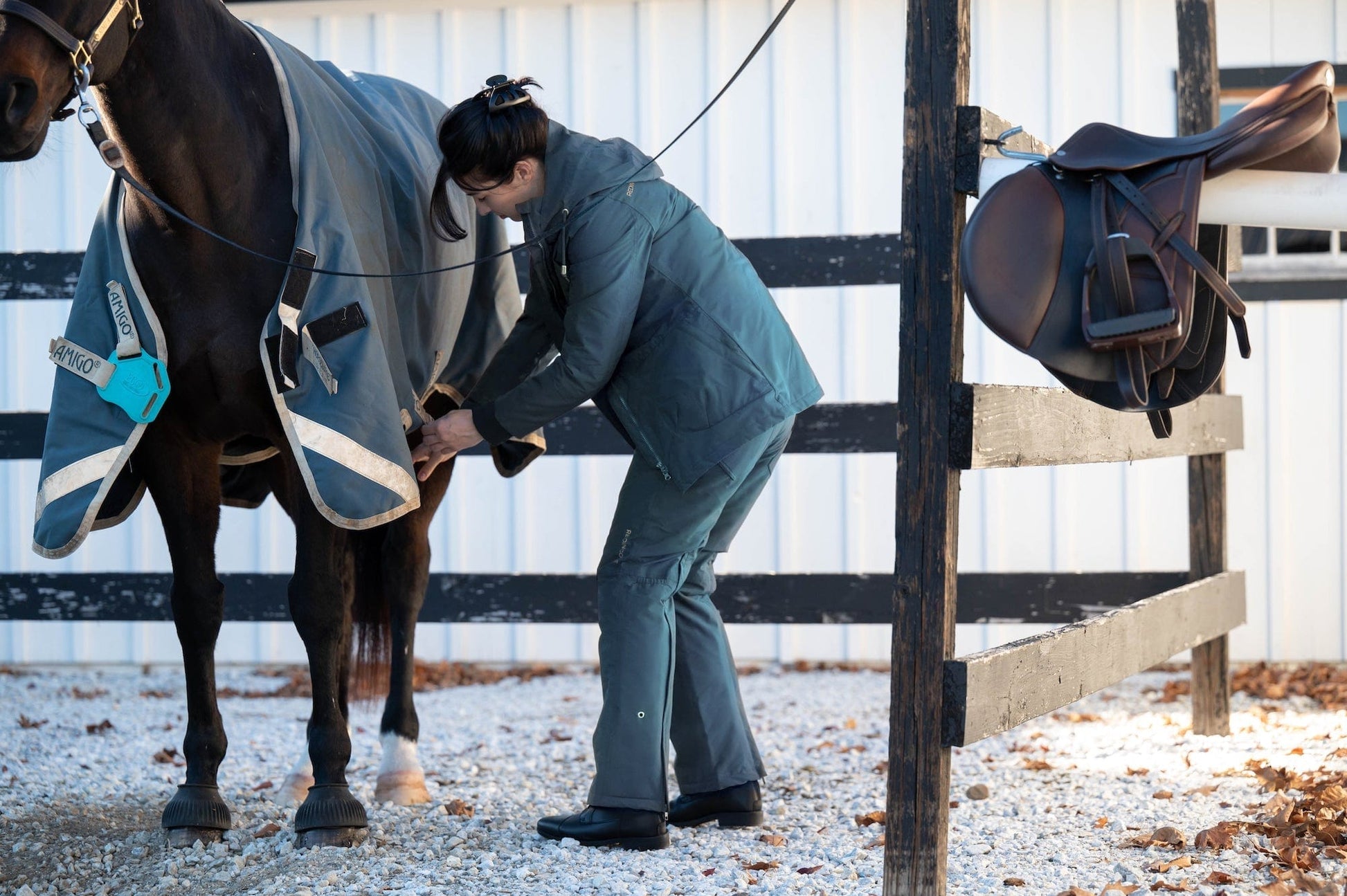 Our much-lauded insulated winter riding jacket is back in a second generation and ready to take on winter with you! It's lighter weight but just as warm, and the backpack straps have been upgraded to a sturdy but soft elastic. Our favorite features include the double ended zipper that allows for hip mobility in the tack, thumbholes to keep your hands warm, and an adjustable riding hood that fits over a helmet.